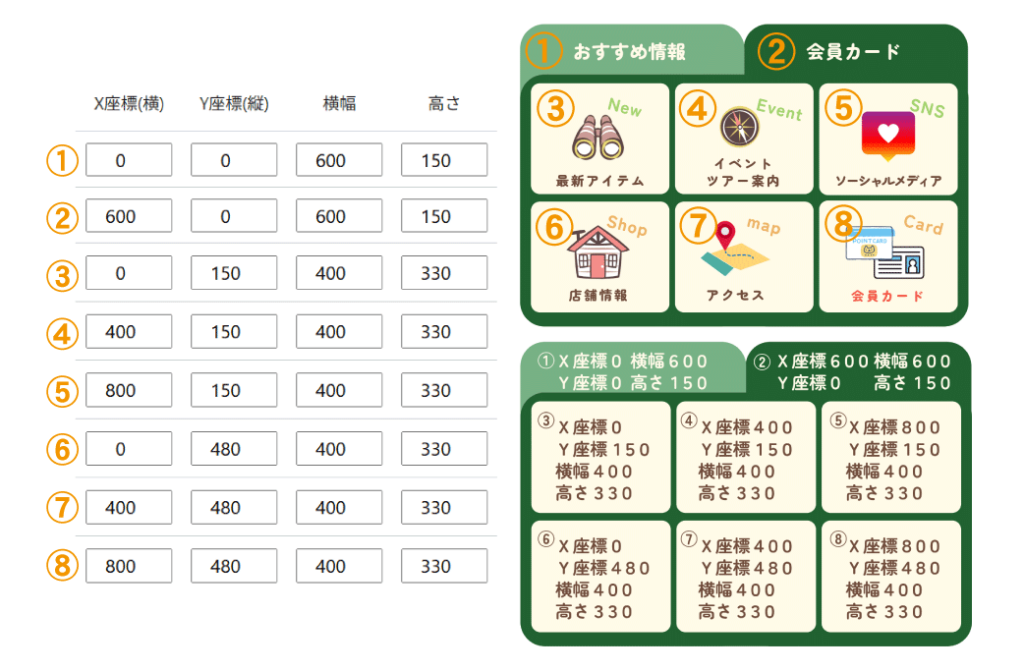 ②会員カード:X=600 Y=0 横幅=600 高さ=150