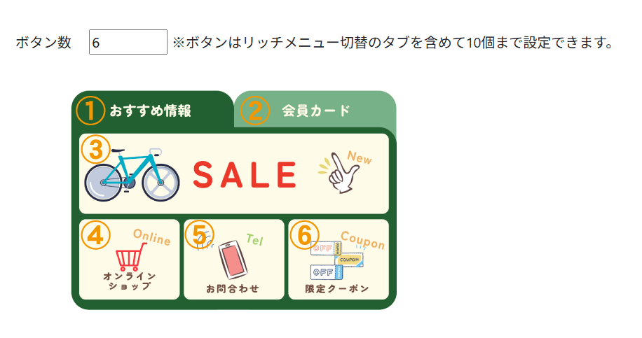 設定例)画像のリッチメニューの設定はボタン数が「6」となります。