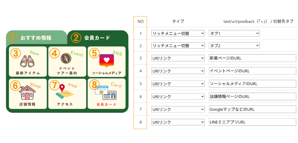 設定例)画像のリッチメニューの設定はボタン数が「8」となります。