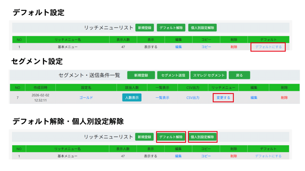 リッチメニューの表示設定・解除には、以下の方法があります。